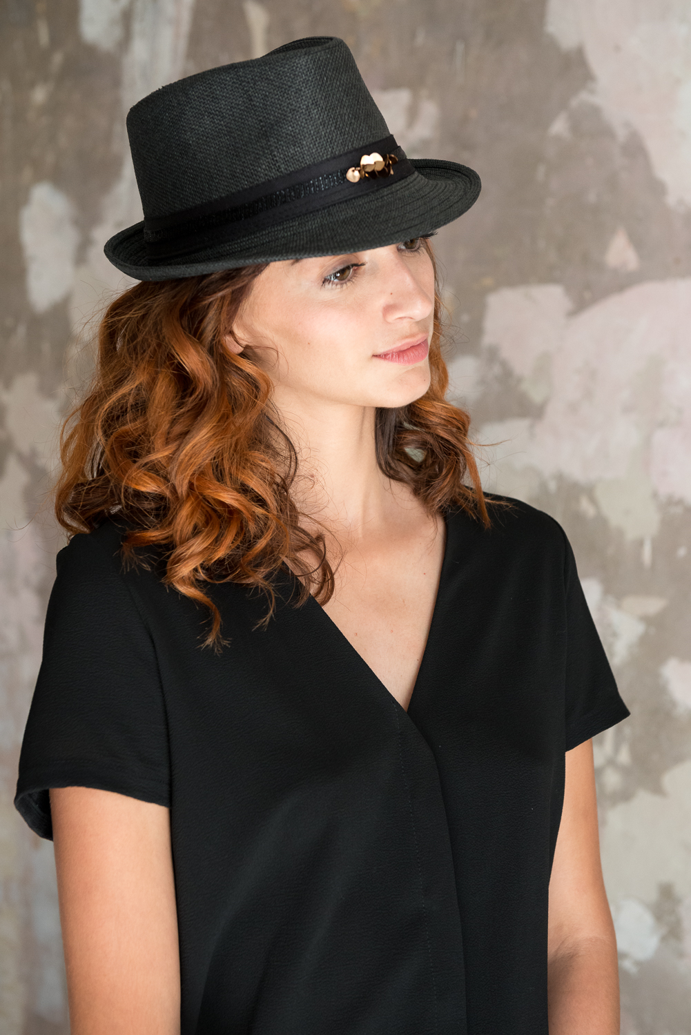 Chapeau de paille noir avec pastilles dorées. Fait en France.