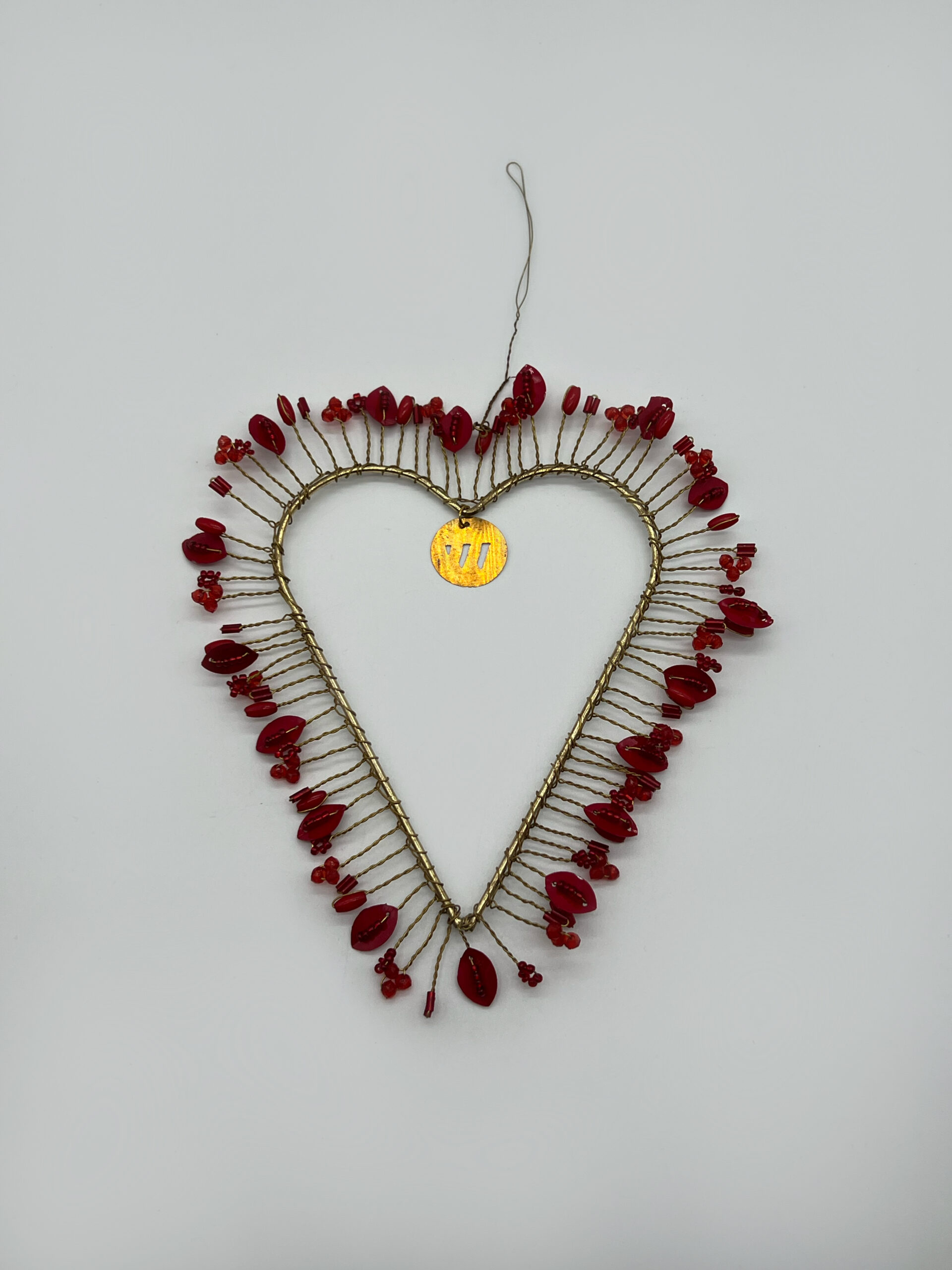 Ornement en forme de cœur, décoré de perles rouges et de cordons dorés. Une pièce raffinée qui apporte chaleur et charme à votre intérieur.