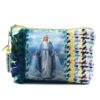 Pochette Manon Martin en coton imprimé avec images pieuses. Pièce unique. Zip or avec breloque et pompons. Doublure à pois. 21cm x 14cm x 5cm.