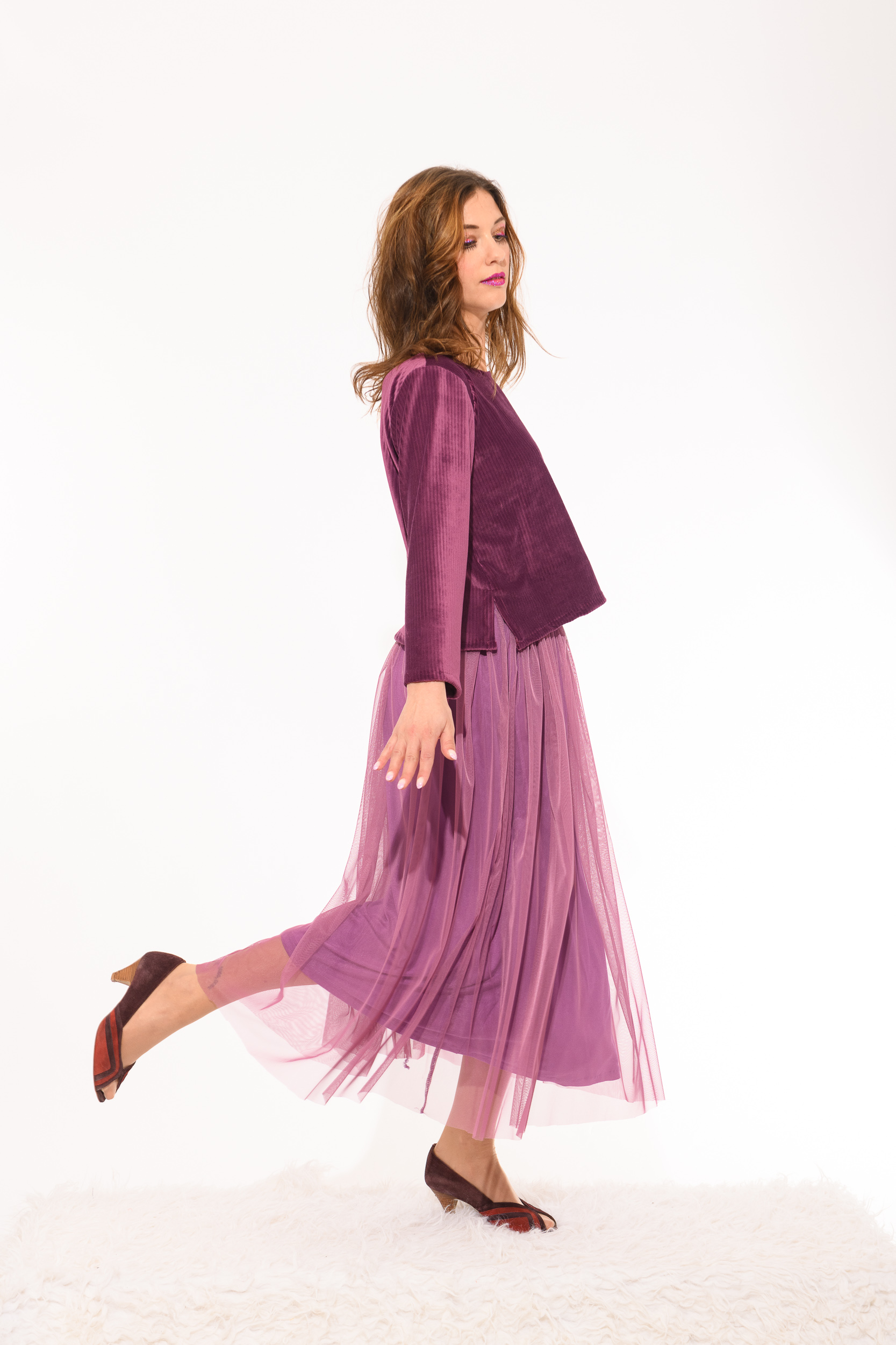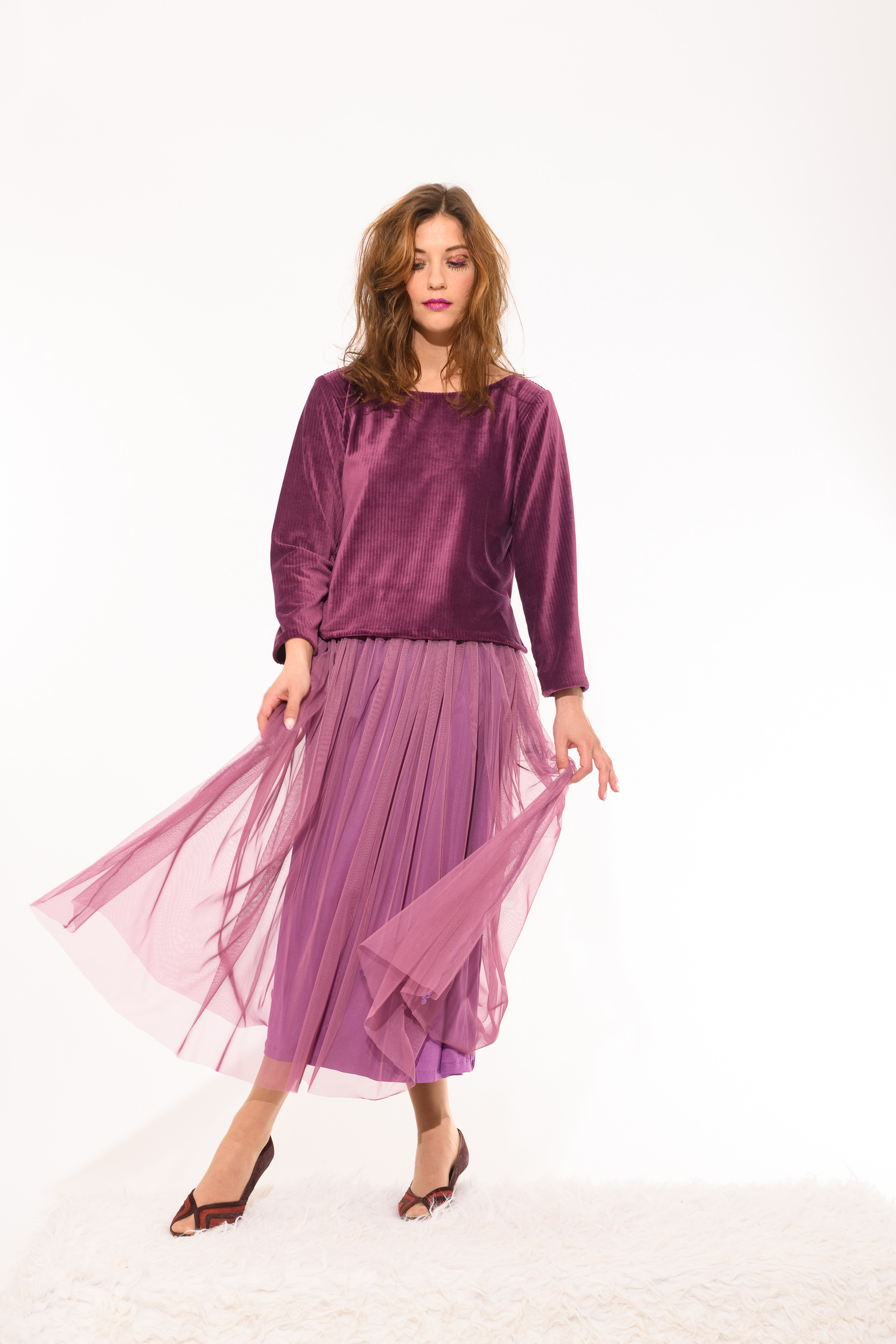 Top Lili lila en velours, col bateau, manches longues, fentes sur les coutures côtés.